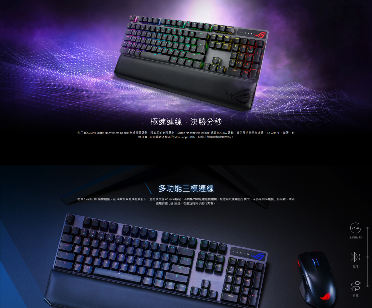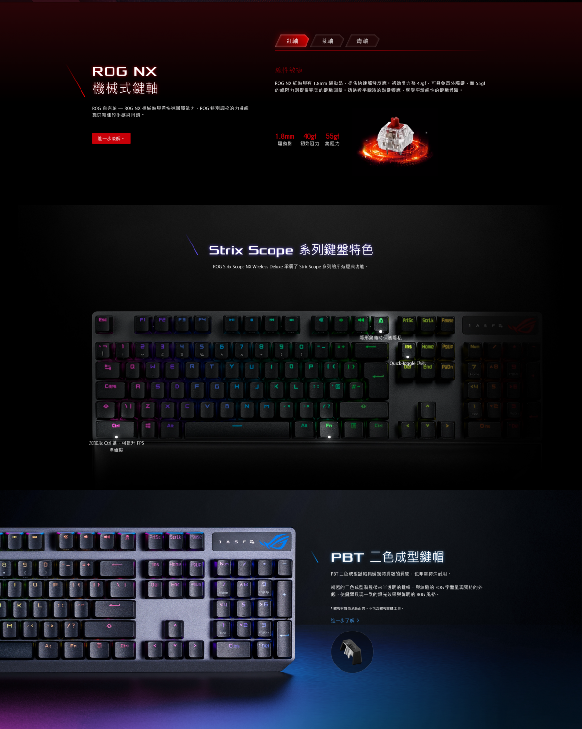 ├ROG Strix Scope NX RGB Wireless Deluxe 機械式電競鍵盤,具備三模連線功能、ROG NX 機械紅軸 / 青軸 / 茶軸、PBT 鍵帽、鋁合金上蓋、磁吸式腕托以及可提升 FPS 精準度的加寬版 Ctrl 鍵