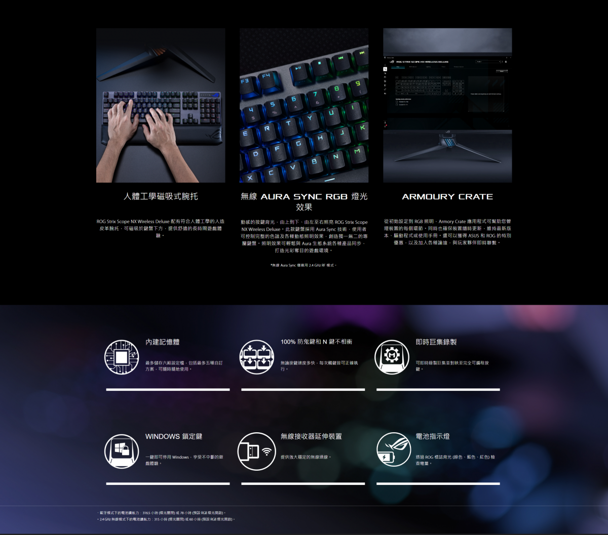 └ROG 自有軸體:ROG NX 機械軸具備 7000 萬次點擊壽命、高速觸發力以及特殊調校的觸發行程,提供絕佳的觸鍵手感與回饋